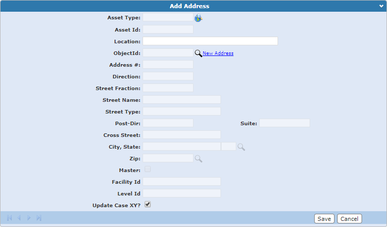 • Object ID (Parcel): The numeric identifier assigned to a piece of land in the geodatabase. Click Select Address from Land Tables to the right of the ObjectId field to open the Address Query panel. This allows you to find the Object ID associated with a specific address. See Add an Address for more information.