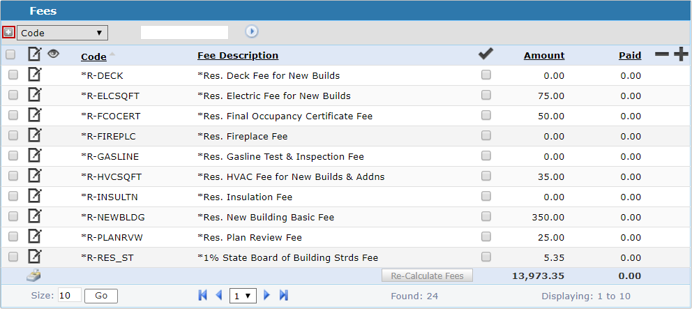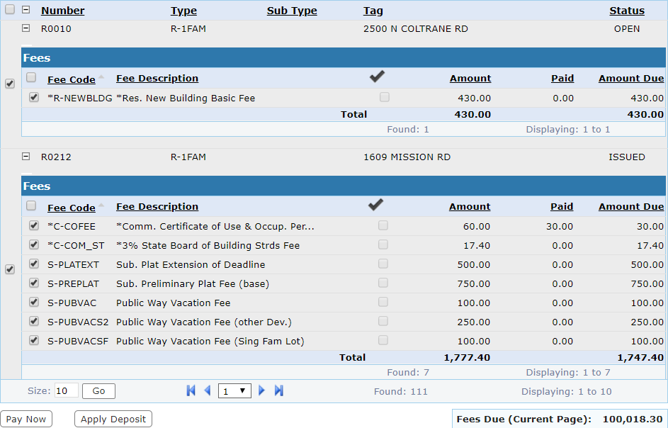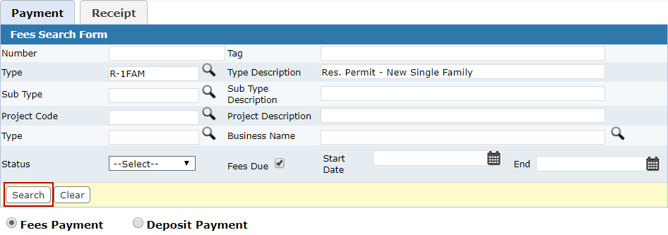 You can search for fees using the Fees panel on the summary page or on the Payment tab of the payment manager window.
