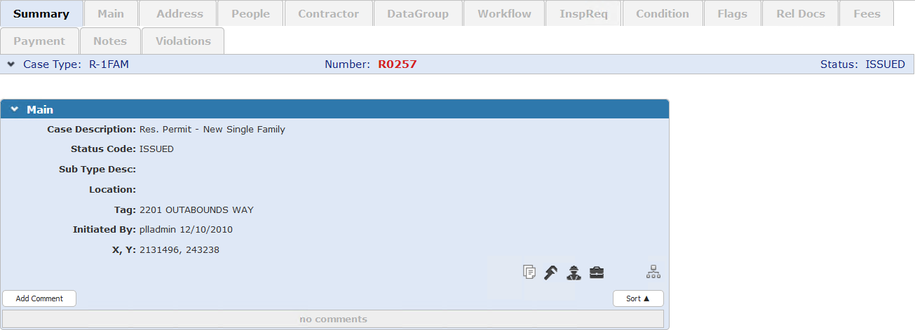 NOTE: The panel names appearing on the summary page are the default labels, but may be changed by the Cityworks administrator. The order of the panels and tabs that appear on this page may differ depending on how the PLL administrator arranged them or which case type is chosen. See Configure Controls on a Case Template in the PLL Admin for 15.8 Guide for more information.